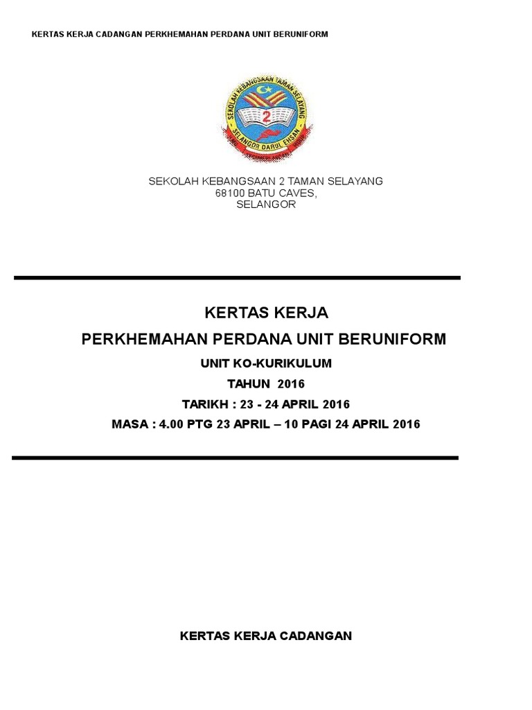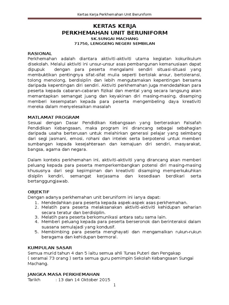 03112016 assalamualaikum di sini saya ingin kongsikan contoh ringkas kertas kerja program perkhemahan unit beruniform peringkat. Dalam entri blog saya kali ini saya coretkan contoh kertas kerja cadangan bagi program perkhemahan bersepadu unit beruniform sekolah yang saya telah hasilkan bagi aktiviti perkhemahan pada tahun ini. Sekolah kebangsaan tunku mahmood 1.